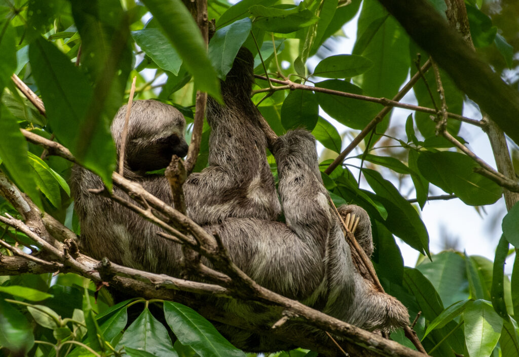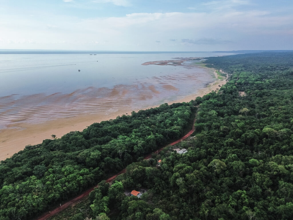 Left photo: Capacity building activity by Nossa Fruits @Nossa Fruits. Centre photo: A three-toed sloth (Bradypus sp.) is seen in the forest canopy in the Tapajós region in the Amazon, Brazil @Chris J Ratcliffe/WWF UK. Right photo: Aerial view of the Tapajós National Forest, in the community of Jamaraquá, state of Pará, Brazil @Gerdeson Oliveira/WWF Brazil.